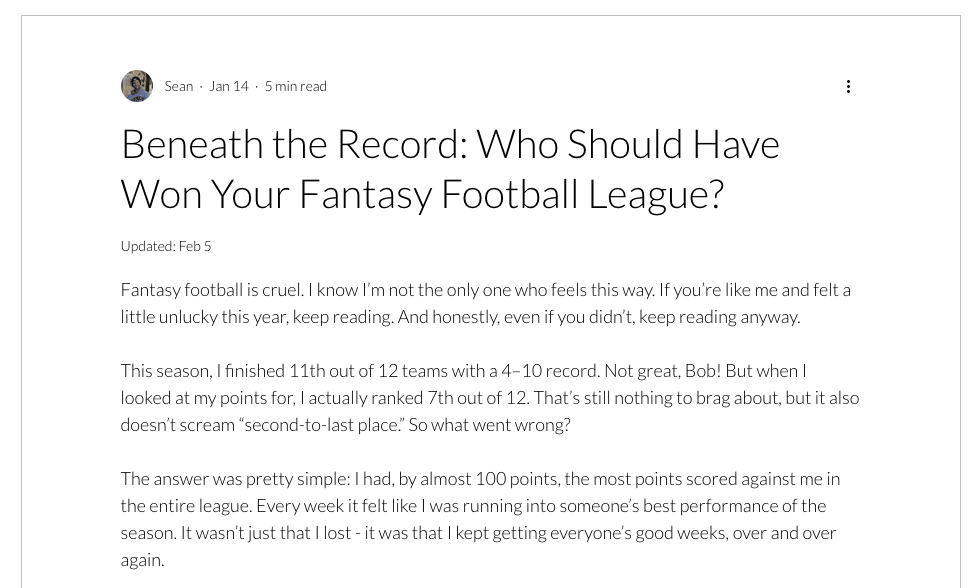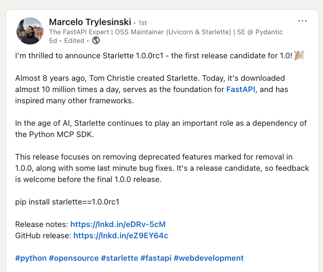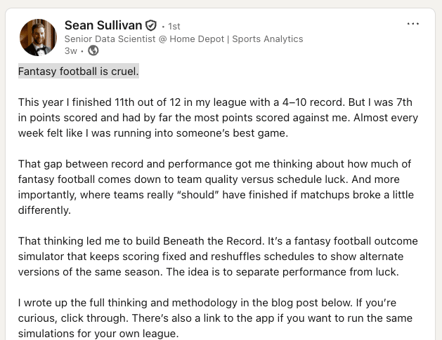 Hi Tip-Sheeters, This week there's big news in Python-land as the Starlette nears the official 1.0 release. I also have an interview with a data scientist who is developing and deploying his code out in public. Let's dive in! Starlette gets the v1.0.0rc release candidateThere's major news in the Python community this week as Marcelo Trylesinski (aka Kludex) announced the release candidate v1.0.0rc of Starlette. This means the full production 1.0 release is on its way. Starlette is an important web framework that implements the ASGI standard for building asynchronous Python web apps, APIs, and the like. It is one of the core dependencies of FastAPI (along with Pydantic) which makes it critical to modern AI and data science. It's also a dependency of FastMCP (and the 1.0 version of FastMCP that's in the official MCP SDK). Why does v1.0 matter so much? Following Semantic Versioning, a 1.0 version generally means that maintainers are committing to a stable major version that users of that library (and other libraries depending on it) can count to avoid breaking changes going forward. A frequent question I see asked is when FastAPI would get to a 1.0 release since so many people are counting on it for production releases even without a 1.0 release. The FastAPI maintainer Sebastián Ramírez often mentioned that FastAPI couldn't get to 1.0 until Starlette did, since it's heavily dependent on Starlette. So I'm guessing the public drumbeat will begin now for a FastAPI 1.0 release -- exciting stuff! Congrats to Marcelo, the original creator Tom Christie and all the Starlette maintainers for this milestone. (Side note on this: if you're using open source code for your projects have you considered putting a little something in the tip jar for the maintainers like Marcelo, Sebastián and others? You can with a few clicks on https://github.com/open-source/sponsors.) Sean Sullivan: Sharing Fantasy Football Analytics with the worldEarlier this month I read statement in a LinkedIn post that spoke to me: Fantasy football is cruel. If you have spent any time on this hobby/obsession, those words probably speak to you too. Sean shared a link to a Streamlit data app that pulls fantasy data from the ESPN fantasy football website using the espn-api Python package (a Python wrapper aka software development kit that simplifies using the ESPN API). I checked it out with my ESPN league (one of way.......to many that I participate in) and the stats were great. I reached out to Sean and he was gracious enough to answer a few questions via Google doc (my own version of asynchronous). A conversation with Sean SullivanSean Sullivan is a senior data scientist from Chicago, Illinois. He is the founder of URAM Analytics, where he shares his original sports analytics research to support the broader sports data community. Ryan: Thanks for taking time for our virtual chat. I enjoyed checking out your Beneath the Record app with my own ESPN fantasy league stats. (Turns out I’ve been a bit fortunate in my league’s regular seasons, but don’t tell my league mates.) Tell us how you came to develop this application and write about it online? Sean: First off, thank you for checking it out and running your league through the app! It’s always nice to know that someone besides myself is using it. I did not start the project thinking I would turn it into an app or write a blog post about it. Like I mentioned in the post, I mostly built it out of curiosity (and a bit of frustration). I felt like my fantasy football team should have finished better if things had broken slightly differently, and I wanted to see whether that belief was even remotely justified. As with most side projects, the scope slowly expanded. What started as “How many wins would a simulation suggest?” turned into “What does the distribution of possible finishing places look like?” which then turned into “How often did the simulations think I should have finished first over the league’s 15 year history?” The more I explored it, the more interesting questions kept popping up. Once I landed on a set of outputs that I found to be interesting, it clicked that this might be something other fantasy players would enjoy. In my public sports analytics work, I try to focus on building things people can actually use rather than doing analysis purely for its own sake. Given that mindset, and my familiarity with Streamlit, turning it into an app felt like a natural next step. As for the blog post, that was very intentional. The app by itself produces results (in the form of charts), but interpretation is where people can get stuck. Writing about the project gave me a chance to explain the motivation, clarify what the outputs mean, and guide how someone might think about the results. It also doubles as documentation of the work and helps people discover the tool through the site. Q2: At a glance it looks like you’re using Streamlit, which I’m a big fan of. What other software, libraries, and hosting services are you using for Beneath the Record? The app is built in Python using Streamlit and relies primarily on pandas, numpy, espn_api, and matplotlib. For deployment, I use Docker and Google Cloud Run. The app is built in Python using Streamlit and relies primarily on pandas, numpy, espn_api, and matplotlib. For deployment, I use Docker and Google Cloud Run. Ryan:You are using Christian Wendt’s espn-api Python library to automatically import data for ESPN. I’ve used similar libraries for other fantasy league APIs like Joey Greco’s pymfl and sleeper. In your experience, why does having a wrapper library or software development kit (SDK) make using an API more convenient for data scientists? Sean: For me, the biggest advantage of using a wrapper library or SDK like espn_api is that it handles all the tedious stuff that comes along with working directly with an API. Instead of dealing with raw JSON responses, the data is exposed through python objects, wh